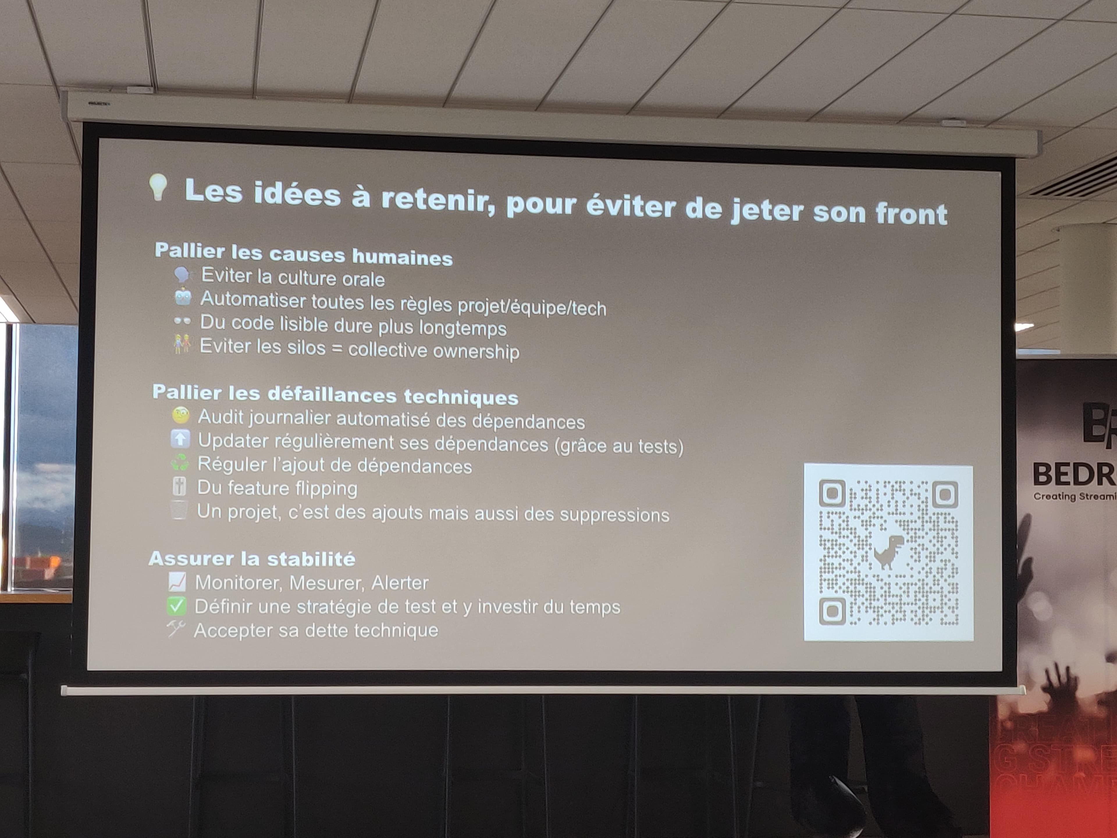 TALK / Comment ne pas jeter son application Frontend tous les deux ans ? Bonnes pratiques pour la maintenance d'une application web Refaire son front tous les 2 ans, c’est devenu une pratique plutôt courante dans tous les projets. Tous ? Non, chez Bedrock streaming, nous avons choisi de rester sur la même codebase et ça depuis plus de 7 ans! En plus, ce n’est pas une petite application puisqu’il s’agit de 6play et de salto. Vous pourriez vous dire: “Oh les pauvres, maintenir une application vieille de presque 10 ans ça doit être un enfer !” Rassurez-vous, ce n’est pas le cas ! Nous avons tous travaillé sur des projets bien moins vieux mais sur lesquels le développement de nouvelles fonctionnalités était bien plus pénible.